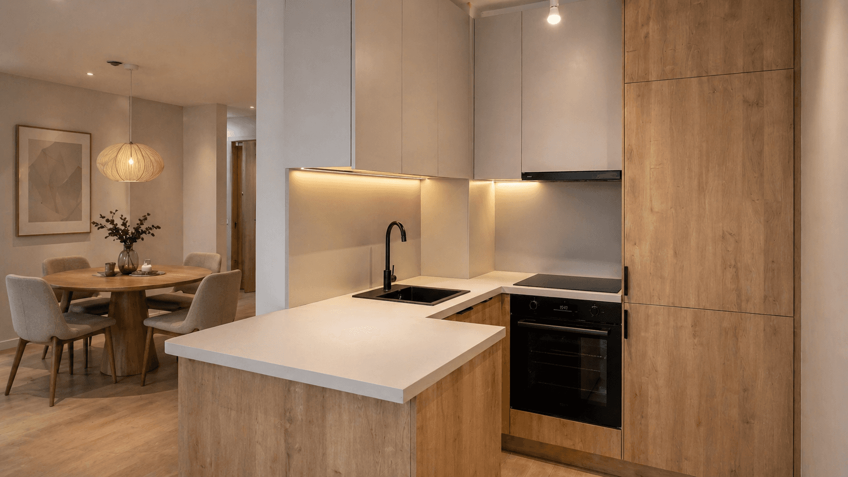 Kompaktna organizacija kuhinje osmišljena je da maksimalno iskoristi prostor uz jasan i intuitivan raspored zona. Poluostrvo dodatno proširuje radnu površinu i povezuje kuhinju s ostatkom enterijera, dok visoki elementi i integrisano odlaganje održavaju prostor urednim, preglednim i funkcionalnim.