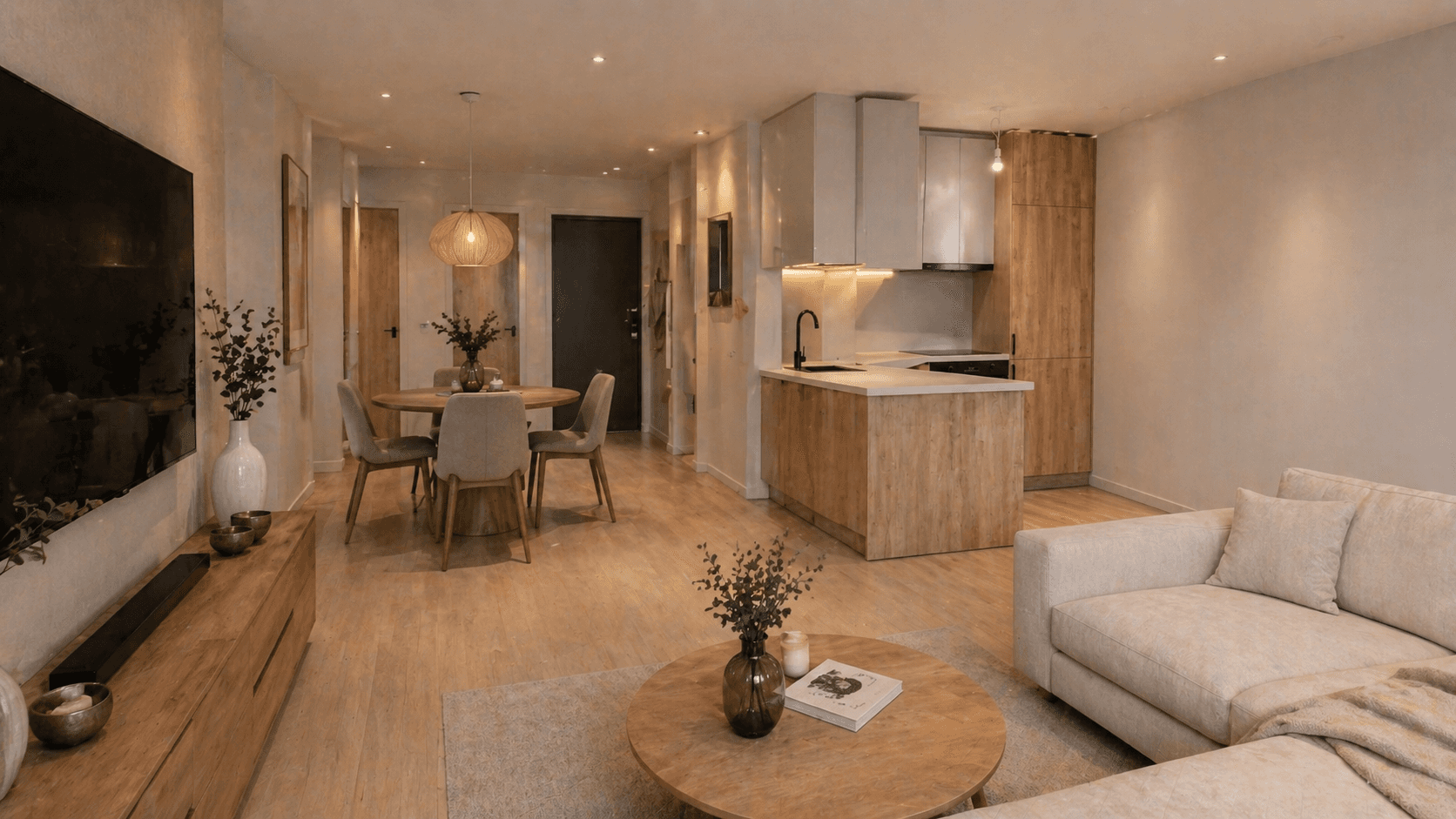 Kašmir tonovi, prirodni dekor drveta i svijetle kompakt površine grade smirenu i bezvremensku materijalnu paletu. Vertikalni elementi i obloge unose toplinu, dok čiste plohe bez vizuelnog opterećenja naglašavaju minimalistički karakter kuhinje. Crni akcenti na armaturi i aparatima daju diskretnu dubinu kompoziciji.
