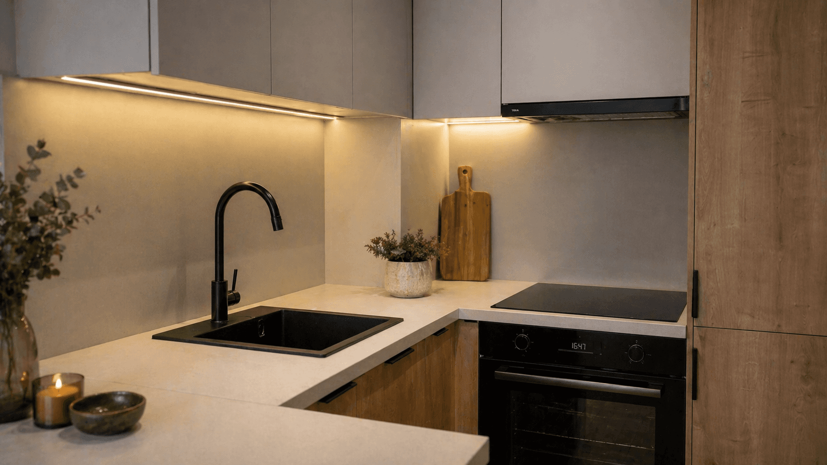 Suptilna podrasvjeta, neutralna paleta i prirodne teksture stvaraju atmosferu smirenosti i topline. Minimalistički pristup ovdje nije hladan, već mekan i ugodan, sa pažljivo odmjerenim detaljima koji prostoru daju profinjenu eleganciju. Rezultat je kuhinja koja djeluje tiho luksuzno i nenametljivo sofisticirano.
