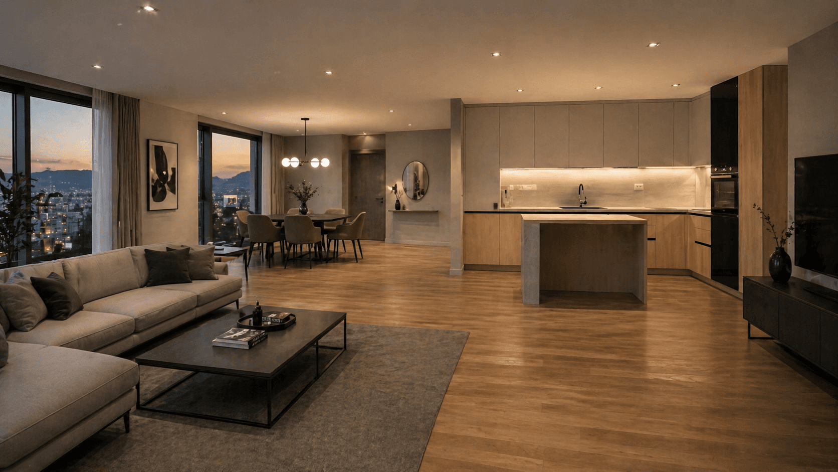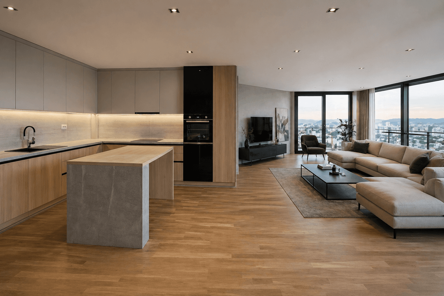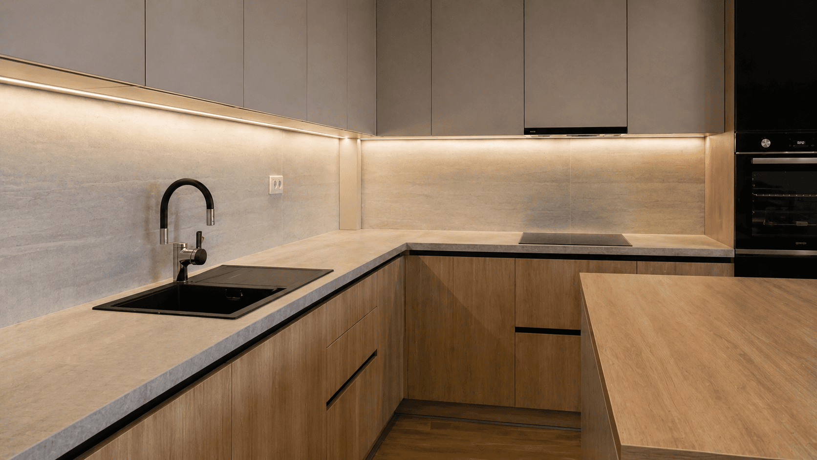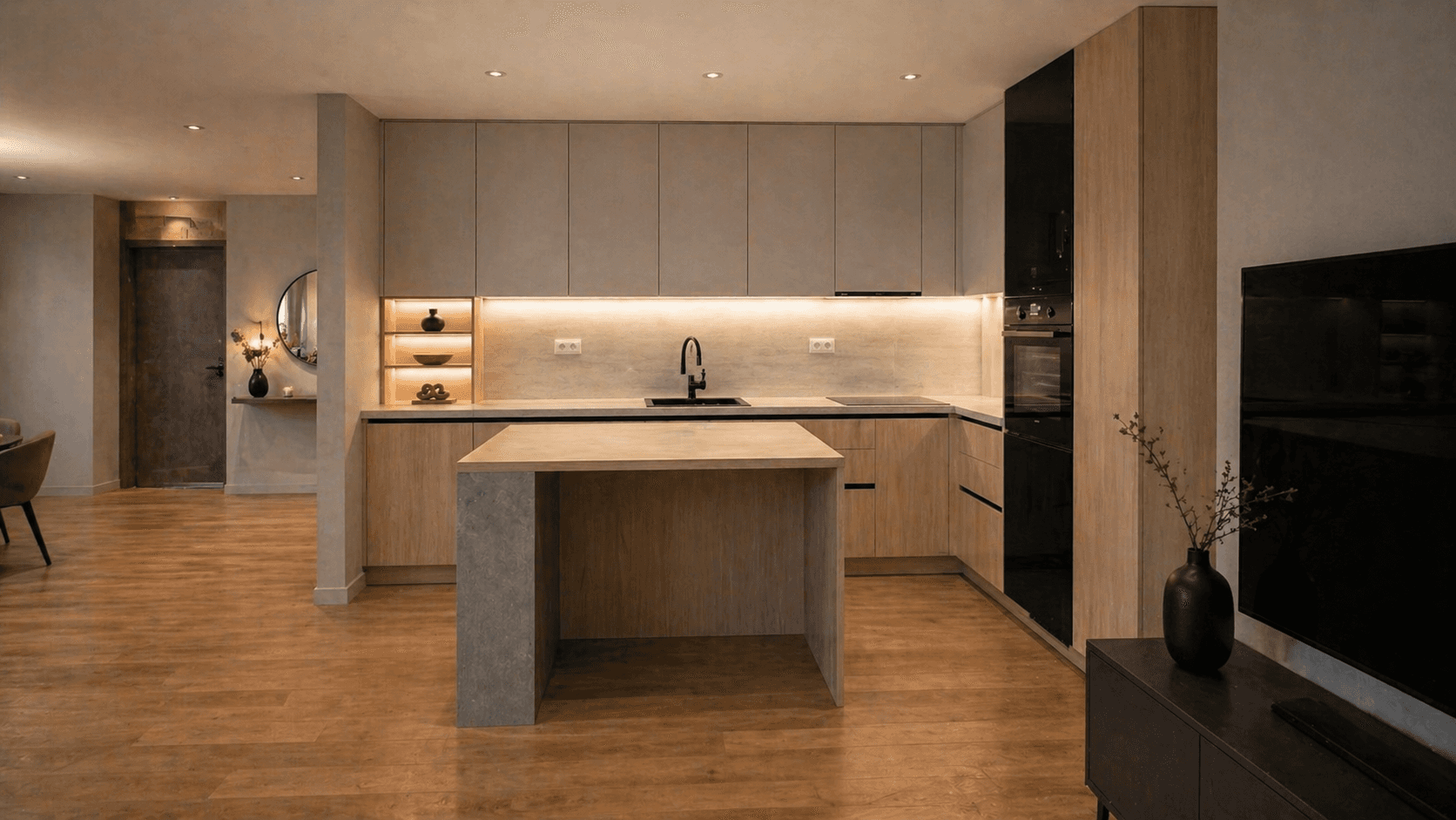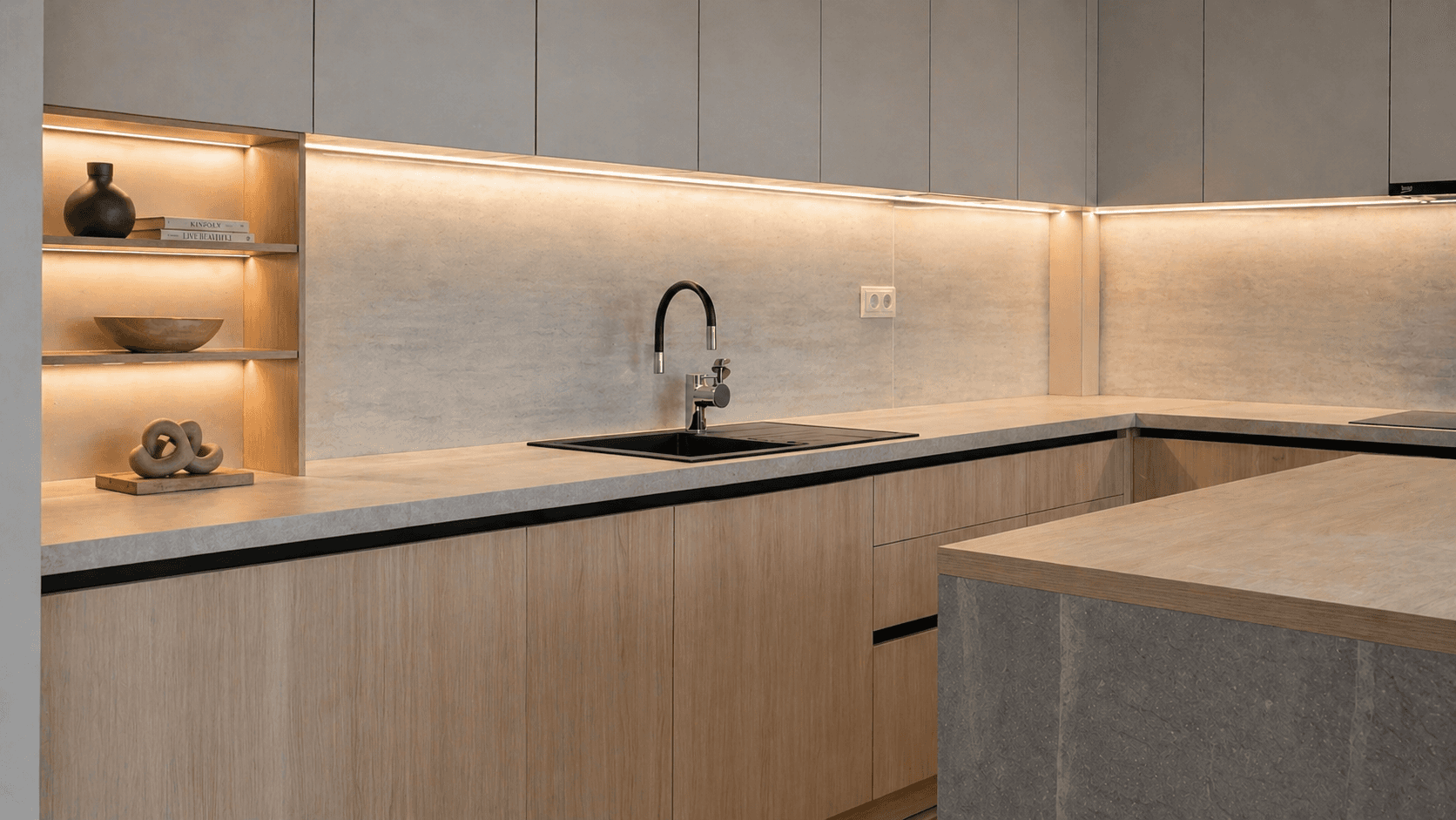 Svijetle drvene teksture, nježne neutralne fronte i kamene površine stvaraju skladnu materijalnu kompoziciju pročišćenog i elegantnog karaktera. Kontrasti su suptilni, ali dovoljno izraženi da prostoru daju dubinu, toplinu i sofisticiran, bezvremenski vizuelni identitet.