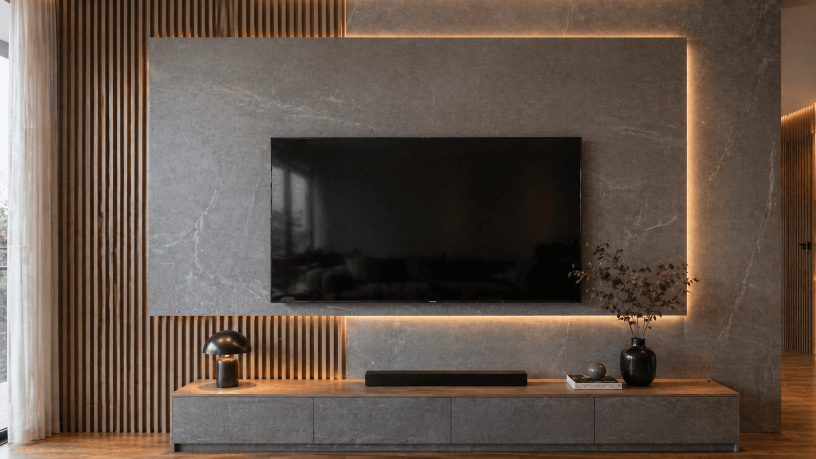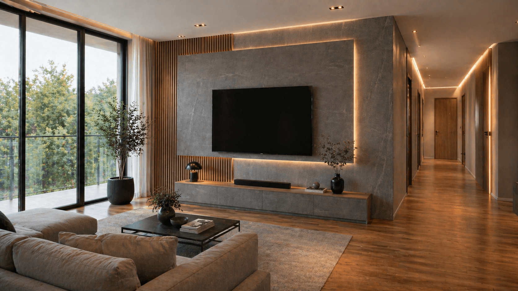 Donji lebdeći element vizuelno povezuje cijeli zid u pročišćenu i uravnoteženu cjelinu, dok materijali i precizni spojevi naglašavaju minimalističku sofisticiranost. Rezultat je bezvremenski feature zid koji spaja funkciju, toplinu, vizuelni mir i arhitektonsku eleganciju.