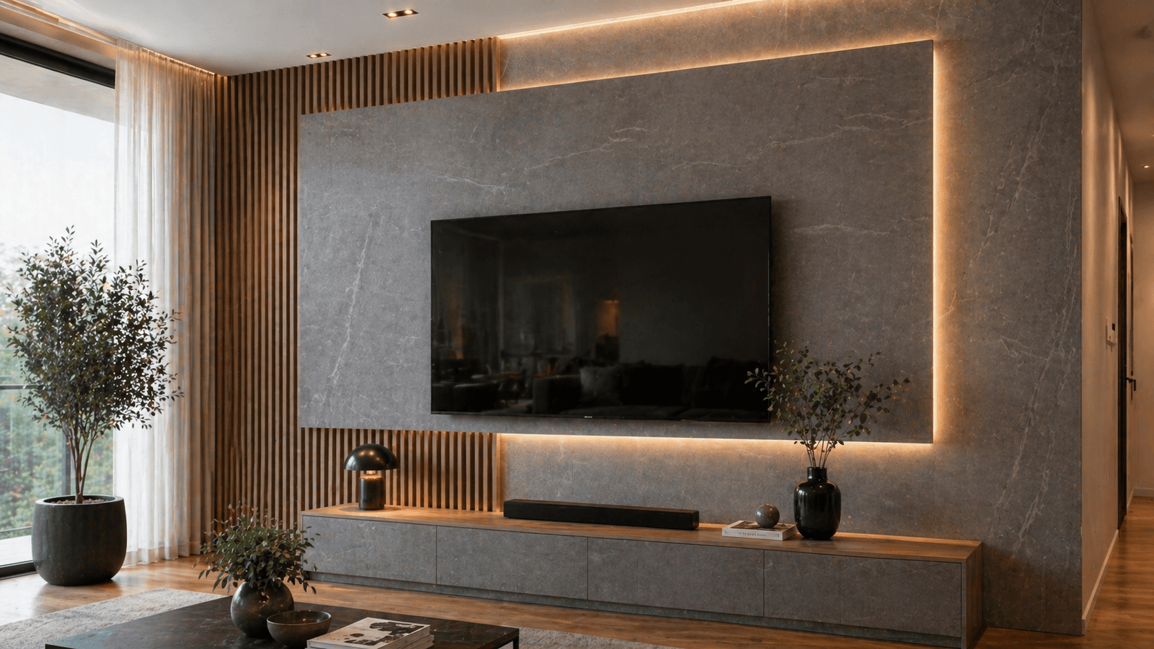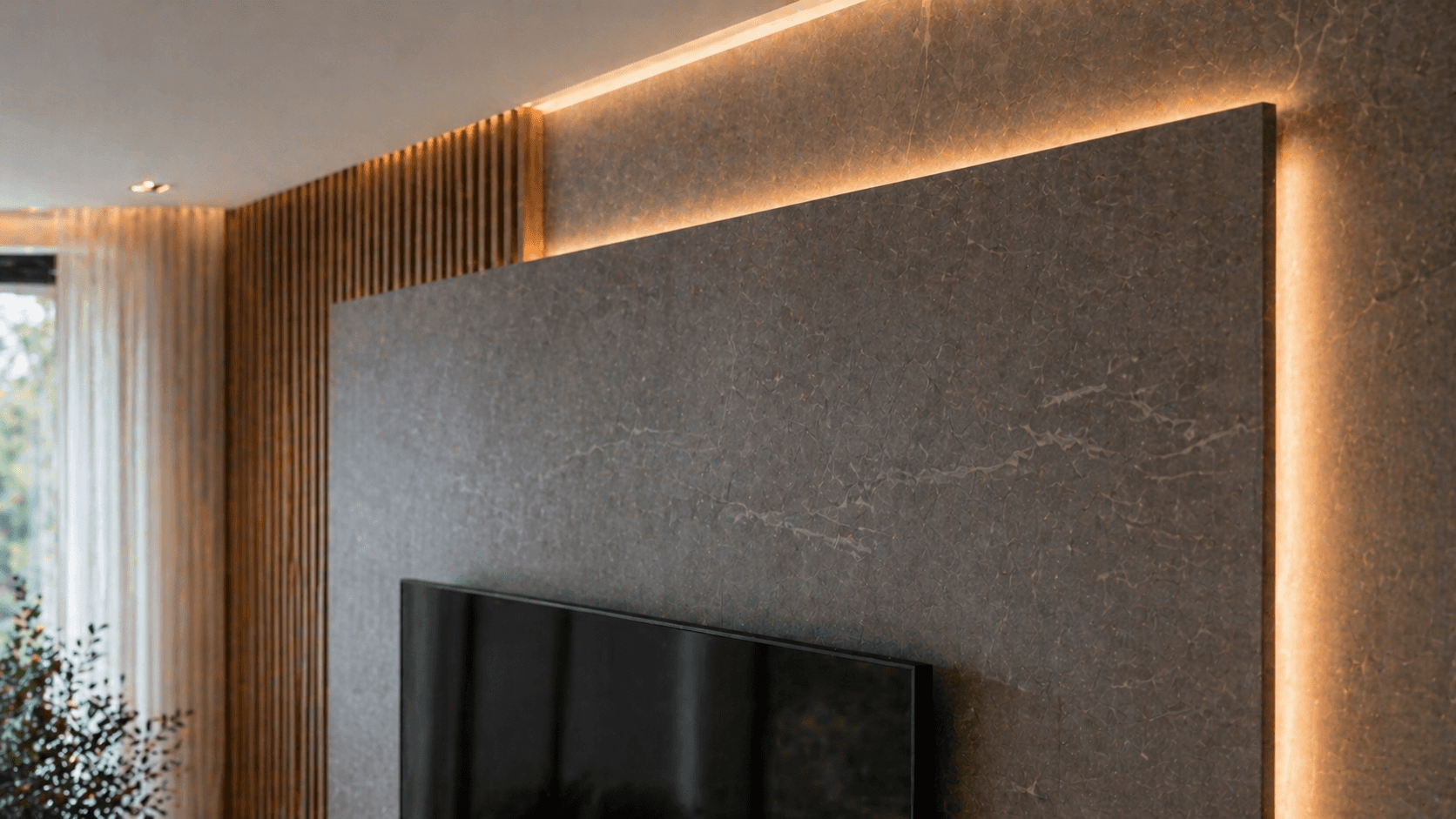 Integrisano linearno osvjetljenje naglašava geometriju panela i stvara lebdeći, sofisticiran efekat oko centralne kompozicije. Svjetlo ovdje nije samo ambijentalni dodatak, već element koji definiše dubinu, atmosferu, prostornu mekoću i karakter cijelog zida.